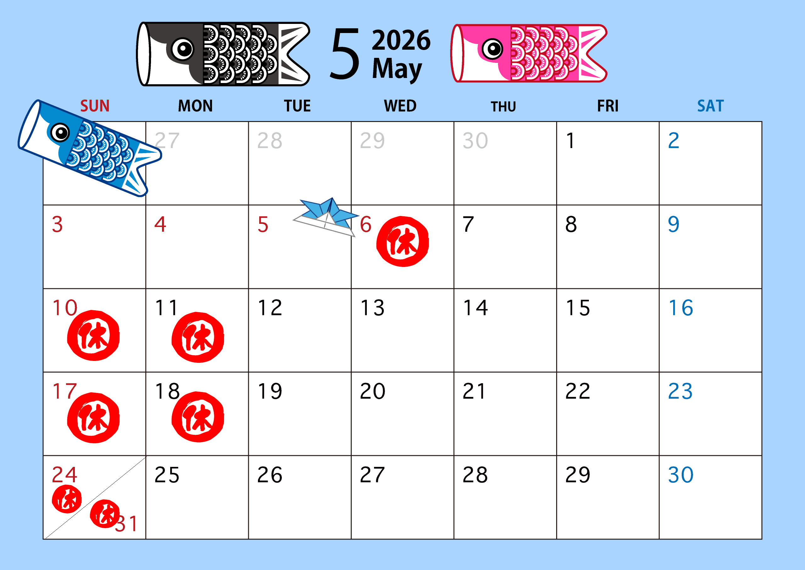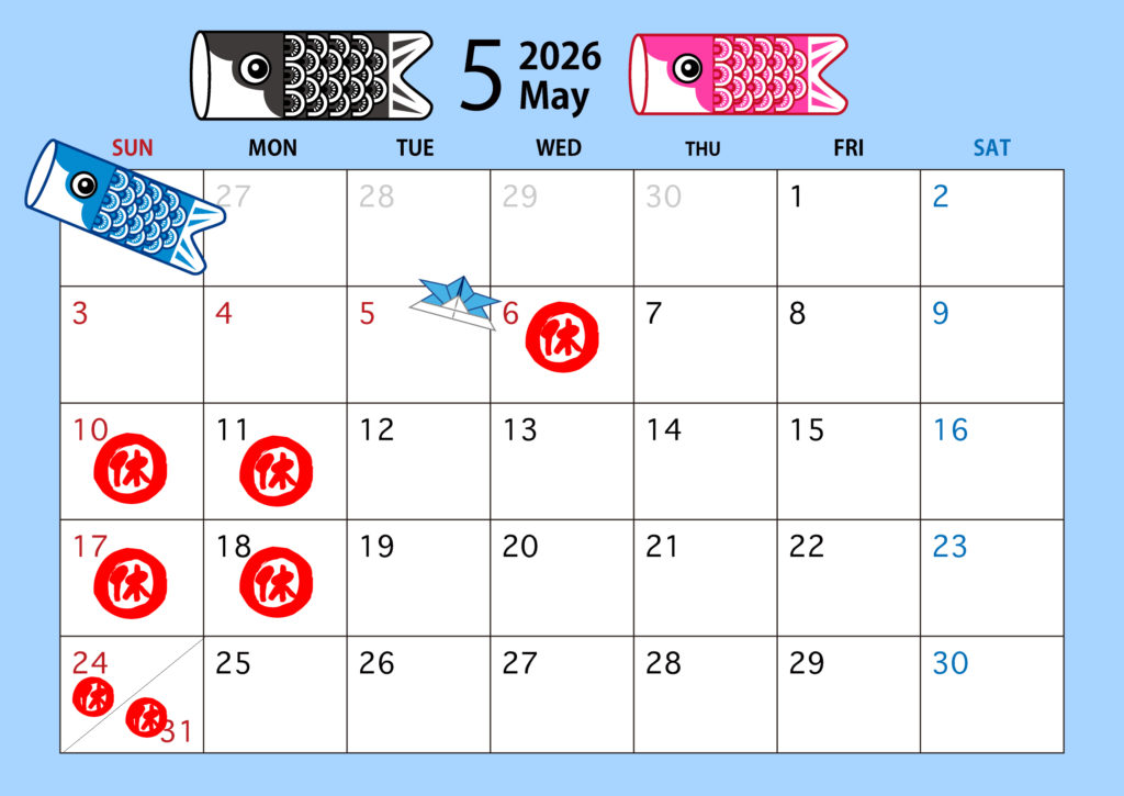 5月のお休みは6日(水)、10日(日)、11日(月)、17日(日)、18日(月)、24日(日)、31日(日)となります。よろしくお願いいたします。